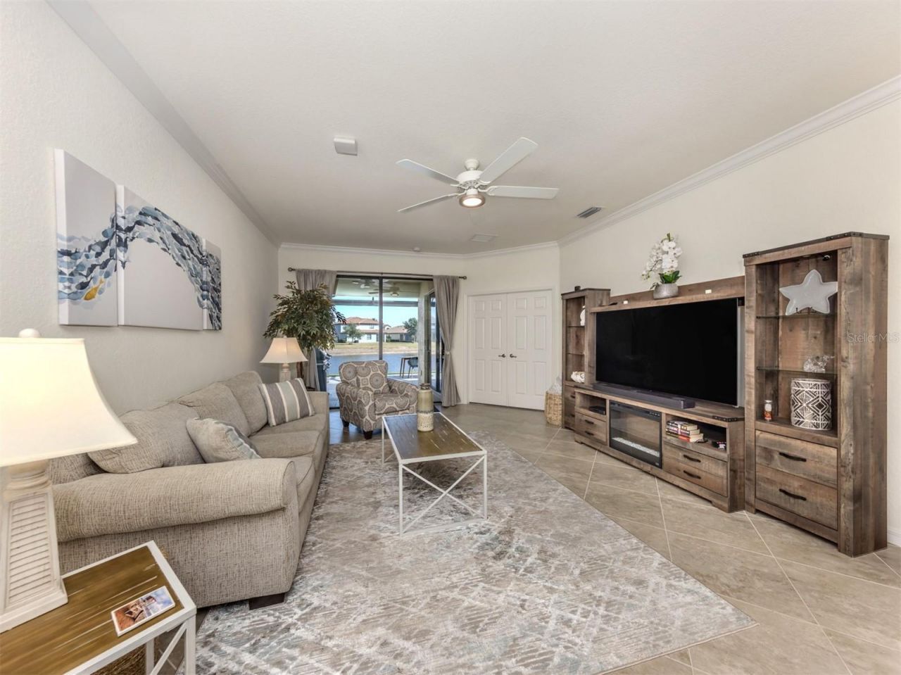 Waterview villa in Gran Paradiso offering resort amenities and true maintenance-free living. This beautifully kept home features 2 bedrooms, a den/extra guest space, 2 full baths, a 2-car garage, granite kitchen with light cabinetry, and diagonal tile flooring. The expanded lanai is perfect for outdoor gatherings and overlooks a serene waterfront setting with added privacy from the open green space next door. Cable, internet, roof, exterior paint, and landscaping are included in one of the area's lowest HOA fees. The CDD is included in taxes. Some furnishings may be negotiable. This villa is not in a flood zone and does not require flood insurance! Be sure to compare lot locations and features when you're searching! Gran Paradiso residents enjoy a 7,000-sq-ft zero-entry heated pool with cabanas, tennis, an active pickleball community, walking trails, a full calendar of social activities, full fitness center, sauna, steam room, library, billiards, and more.The community's back gate is just around the corner from this villa and leads directly to downtown Wellen Park, with restaurants, shopping, Friday night concerts, and the Atlanta Braves spring training complex. Public golf courses are plentiful throughout the area. Downtown Venice and Sarasota are about 20 minutes away, along with several top Gulf beaches. Multiple airports nearby make travel easy for snowbirds and guests. Gran Paradiso offers a luxury lifestyle, and this villa puts it all within reach.