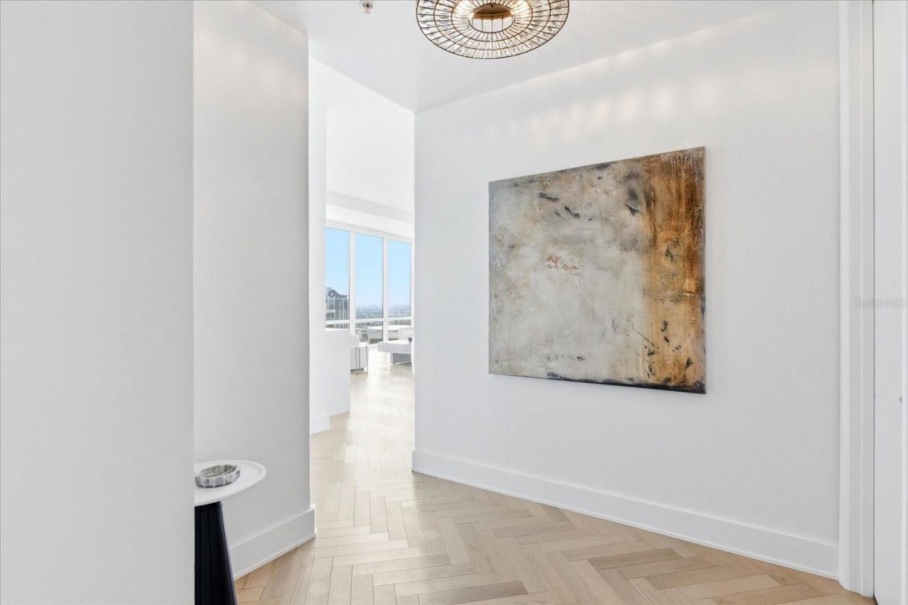 Positioned on the 30th floor-within the building's most coveted upper tier, where only the top five levels capture the most unobstructed skyline and sky exposure-this southwest corner 02 residence offers 2,159 square feet shaped by light, volume, and uninterrupted views.A true corner layout with dual exposures along the south and west walls creates a continuous wrap of glass, allowing natural light to move across the interiors while framing city and skyline.New herringbone wood flooring in a light, natural tone-reminiscent of European oak-runs throughout the main living areas and into the primary suite, installed prior to the kitchen so cabinetry sits above a continuous flooring plane.The palette is intentionally restrained, with the natural tone of the flooring, the custom-stained rift oak cabinetry, and the pale wall palette working together as a cohesive composition.The kitchen was taken fully to the studs, allowing for a complete reworking of layout, cabinetry, and electrical. Custom rift oak cabinetry, finished in a tailored stain aligned with the tones of the flooring, extends to the ceiling with integrated storage. A quartz waterfall island and full-height slab backsplash anchor the space, with outlets relocated beneath the cabinetry to preserve the integrity of the stone. Matte charcoal hardware and a champagne-toned faucet are echoed in the lighting selections, creating continuity throughout. Under-cabinet lighting and a single downlight over the island provide controlled, focused illumination.An extended run of rift oak cabinetry continues into the living area with integrated wine storage, forming a defined architectural backdrop that anchors the open plan.Electrical systems have been modernized with digital controls, dimmers, and clean, screwless plates throughout. Two HVAC systems provide balanced climate control across the full depth of the residence. Walls are finished in Benjamin Moore Chantilly Lace, selected to maintain a consistent tone as light shifts from day to evening.The primary suite is scaled beyond typical layouts in the building and unfolds into a dedicated lounge positioned along the corner glass. This space reads as a natural extension of the suite-functioning as a secondary living area for media, reading, or quiet retreat-with direct access to a private balcony.The primary bath is finished in full-height stone with a soaking tub, glass-enclosed shower, and dual vanity. The walk-in closet offers substantial volume and presents an opportunity for future customization if desired.Two outdoor spaces extend the living areas: a balcony off the main living room and a second balcony accessed from the primary suite, providing a more private outdoor setting.Secondary bedrooms are thoughtfully arranged for privacy, with a guest en suite positioned at the front of the residence while an additional bedroom is located adjacent to the primary suite-well suited as an executive office or private study-creating separation between guest accommodations and the primary living areas.The Vue at Lake Eola is a full-service high-rise offering 24/7 staffed security, biometric access, valet parking, and a 7th-floor amenity level with fitness center, basketball and tennis courts, a junior Olympic pool with cabanas, club lounge, private theater, and outdoor dining with grills and seating-supporting a fully serviced residential experience.