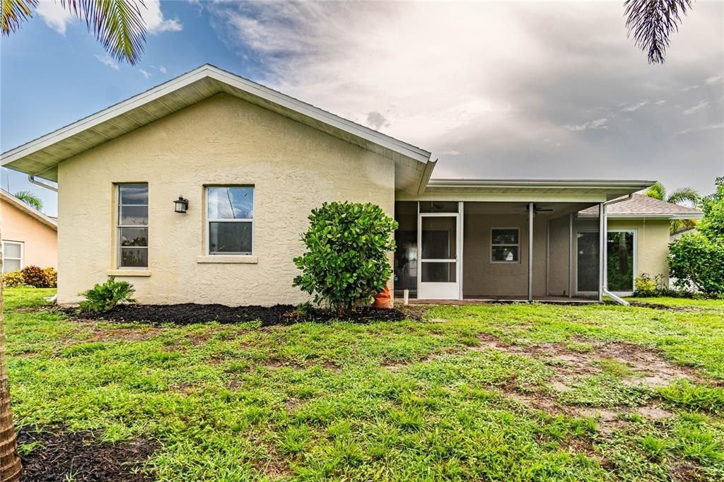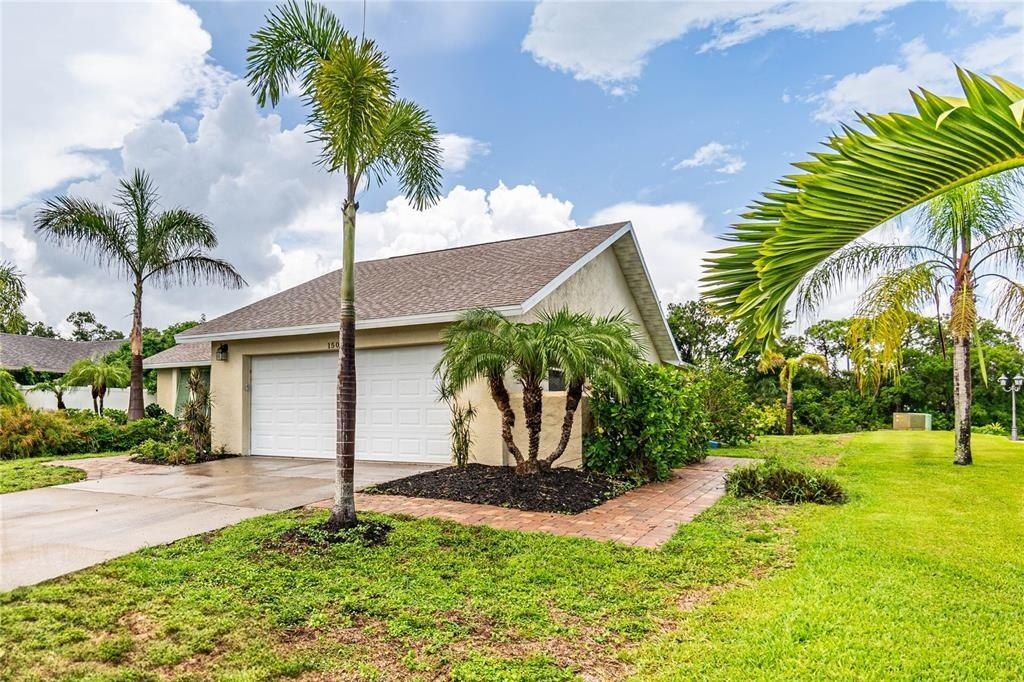 Seller is motivated! Bring all reasonable offers. Welcome to your Florida tropical paradise! This completely renovated home has an open floor plan, an island range/hood, quartz countertops, lush landscaping, paver walkways, and Bahamian shutters that set the stage for the level of ownership this home exudes! This move-in ready Village Green home is the ideal spot for your primary home, second home, or investment property. With soaring cathedral ceilings, this 2 bedroom/2 bath open floor plan has a great flow with its multiple living and dining spaces. Washing dishes has never been so calming with the peaceful water views from the well-appointed kitchen. The master bedroom retreat has sliders accessing the lanai and the back yard, and is equipped with ample closet space. The master bathroom has nice a vanity, beautiful ceramic tile, and an accessible walk-in shower. With lots of storage space and its own bathroom, the second bedroom makes a nice guest room or office. The oversized 2-car garage has epoxied floors and has ample space for storage, tools, etc. The AC is 3 years old (2021). Please note: The irrigation system pulls from the lake water, saving money on your water bills. Also, HOA is optional. Book your appointment today!