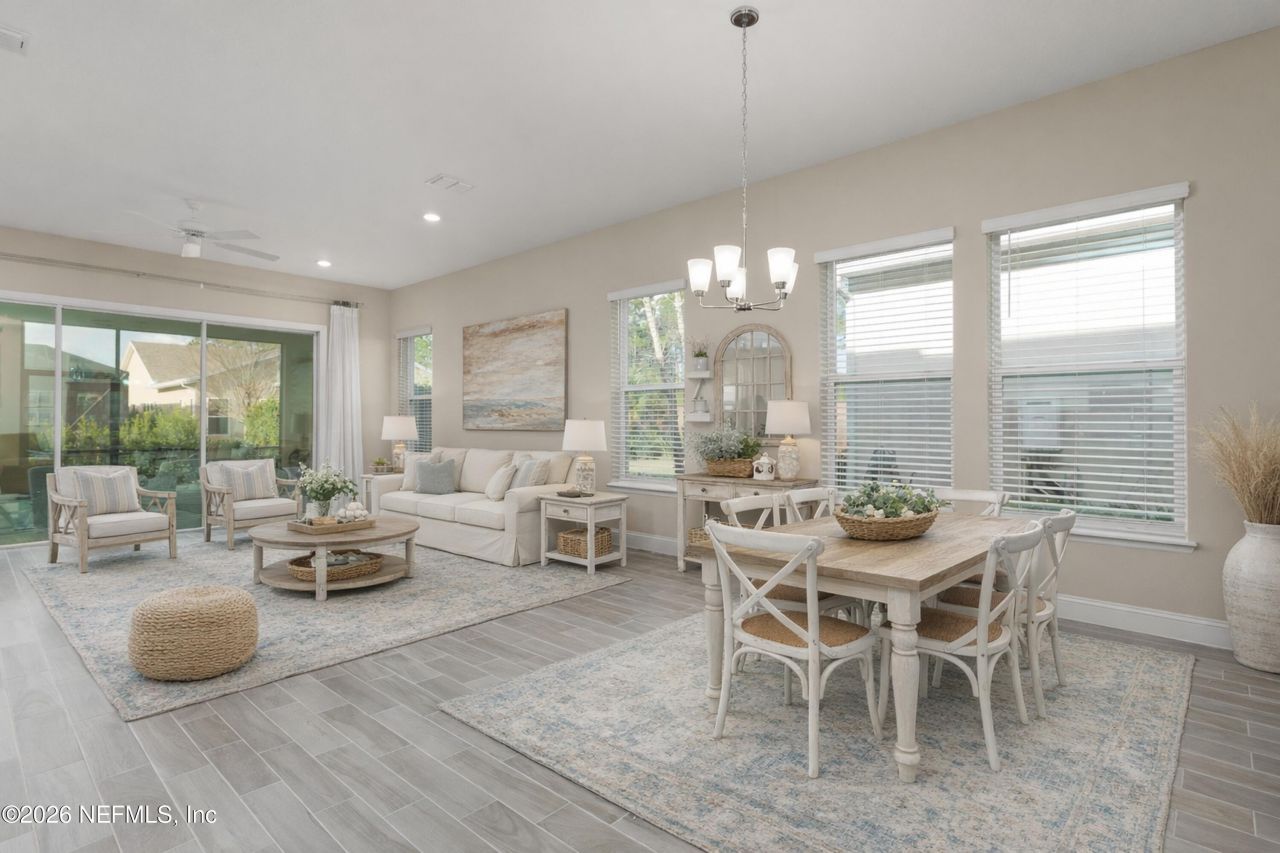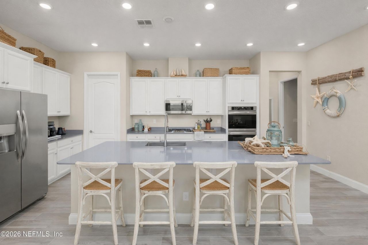 Welcome to Artisan Lakes, Nocatee's gated 55+ active adult community known for its vibrant, low maintenance lifestyle. One of three 55+ neighborhoods in Nocatee, this intimate enclave of just 196 homes offers resort style amenities including a pool, clubhouse, pickleball, putting green, social and fitness programming, and lawn care included in the HOA. Built in 2020 and offering 2,306 sq. ft., this home is newer than most and delivers exceptional value for the size, layout, and features. You will find 3 bedrooms, 3 FULL bathrooms, plus a flex room with French doors ideal for a home office, hobby room, or den. Perfectly positioned on a cul de sac in a natural gas community, the home features a fenced rear yard, screened lanai, and easy golf cart access to Nocatee's extensive amenities, shopping, and dining. The layout includes two guest bedrooms, one with its own ensuite, along with a spacious primary suite, making it ideal for guests and everyday comfort. Inside, enjoy abundant natural light, 10 foot ceilings, wood look tile flooring in main living areas, and an open kitchen with quartz countertops, gas cooktop, custom cabinetry, and a large island designed for entertaining. You will not find a better value in Artisan Lakes. Move in ready and perfectly suited for active adult living, this home is ready for new owners to call it home.