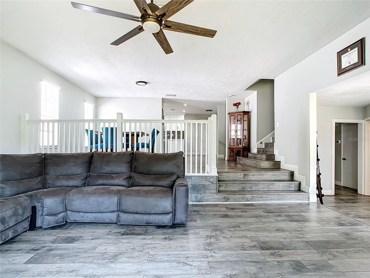Dunedin - Spanish Acres - Renovated 4 bedroom, 3 bath, 2 car garage home on an oversized double corner lot. This two-story home with almost 3000 square feet is perfect for a large or multigenerational family. When you arrive, you are greeted with a quaint front porch and vibrant entry door. Upon entering the home you feel the open-concept living, dining, and kitchen - great for entertaining. The light and bright modern kitchen has white shaker soft-close cabinets, quartz countertops, stainless appliances, and custom tiled backsplash. There is also a door to the outdoor living space and rear yard. The family room is down a few steps and includes a brick-faced, wood-burning fireplace. Adjacent is the bonus room and additional bath. The oversized bonus room has a separate entrance and patio and has been used as a 5th bedroom. The master suite is upstairs and is complete with a sitting area, a walk-in closet, and en suite bath. The master bedroom has multiple windows allowing the natural light to bathe the space. The master bath has a quartz-topped, double sink vanity, as well as a separate room with a custom tiled walk-in shower with glass surround and commode. Also upstairs - Bedrooms 2 and 3 are oversized and are complete with walk-in closets, laminate flooring, and updated windows. The shared hall bath has a quartz-topped double sink vanity and a separate room with the shower/tub combo with custom tiled surround and the commode. Bedroom 4 is back downstairs and could be used as a guestroom or office. There is also an indoor laundry room. The outdoor living space has multiple entertainment areas. The deck is just off the kitchen, great for dining alfresco. A few steps down is the brick patio for additional screened space to enjoy the Florida lifestyle. The backyard is surrounded by a white vinyl fence and has a firepit for fun times with family and friends. Imagine installing the pool of your dreams... There is a utility easement with a service system in the yard. Access is not frequently required. This home is in Flood Zone X and has no HOA fees. Laminate flooring throughout for easy maintenance. Exterior paint 2021. HVAC 2021. Hurricane-reinforced garage door. Located in desirable Dunedin with all it has to offer. Near Downtown Dunedin, The Pinellas Trail, and Honeymoon Island. Close to restaurants, shopping, and entertainment. Schedule your showing today!