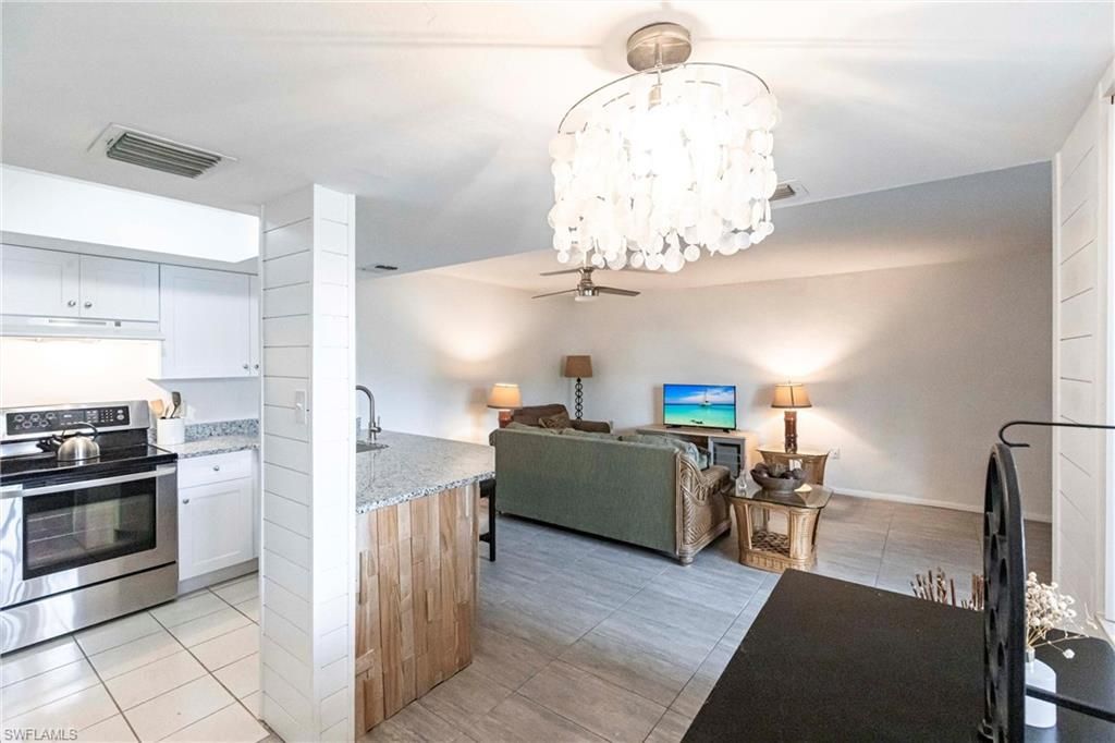 OWNER FINANCING AVAILABLE. Ready to move in and TOTALLY RENOVATED: This 1st Floor 1 bedroom condo is one of the nicest condos in all of Fountain Lakes. Custom Ship Lap on accent walls, a $17,000 renovation in the kitchen with brand new solid wood kitchen cabinetry with soft close drawers and dovetail drawer construction, Solid Granite Counters, LG stainless steel appliances and a stainless steel kitchen sink. The entire condo has beautiful tile flooring (NO CARPET!), so it is easy to maintain. The bathroom has been totally renovated in 2021 with upscale quartz and a walk in shower. NEW A/C SYSTEM and NEW HOT WATER TANK in 2023. Bring your toothbrush and everything is included! Yes, TURNKEY. Enjoy the active community of Fountain Lakes with a 9 HOLE PRIVATE BUNDLED GOLF COURSE and putting green, community swimming pools and spa, tennis, bocce, playgrounds, walking paths, and all the amenities that make the residents SMILE in the sunshine! Especially when you get ALL THIS FOR LOW HOA FEES! Notice the custom ship lap in the bathroom, dining and kitchen areas. Located right across from one of the best SHOPPING MALLS in SW Florida - COCONUT POINT, featuring over 100 stores and over 30 restaurants to choose from! Only about a 20 minute drive to the SW FL REGIONAL AIRPORT and only 20 minutes to the BEACHES! Come and enjoy the Florida lifestyle!