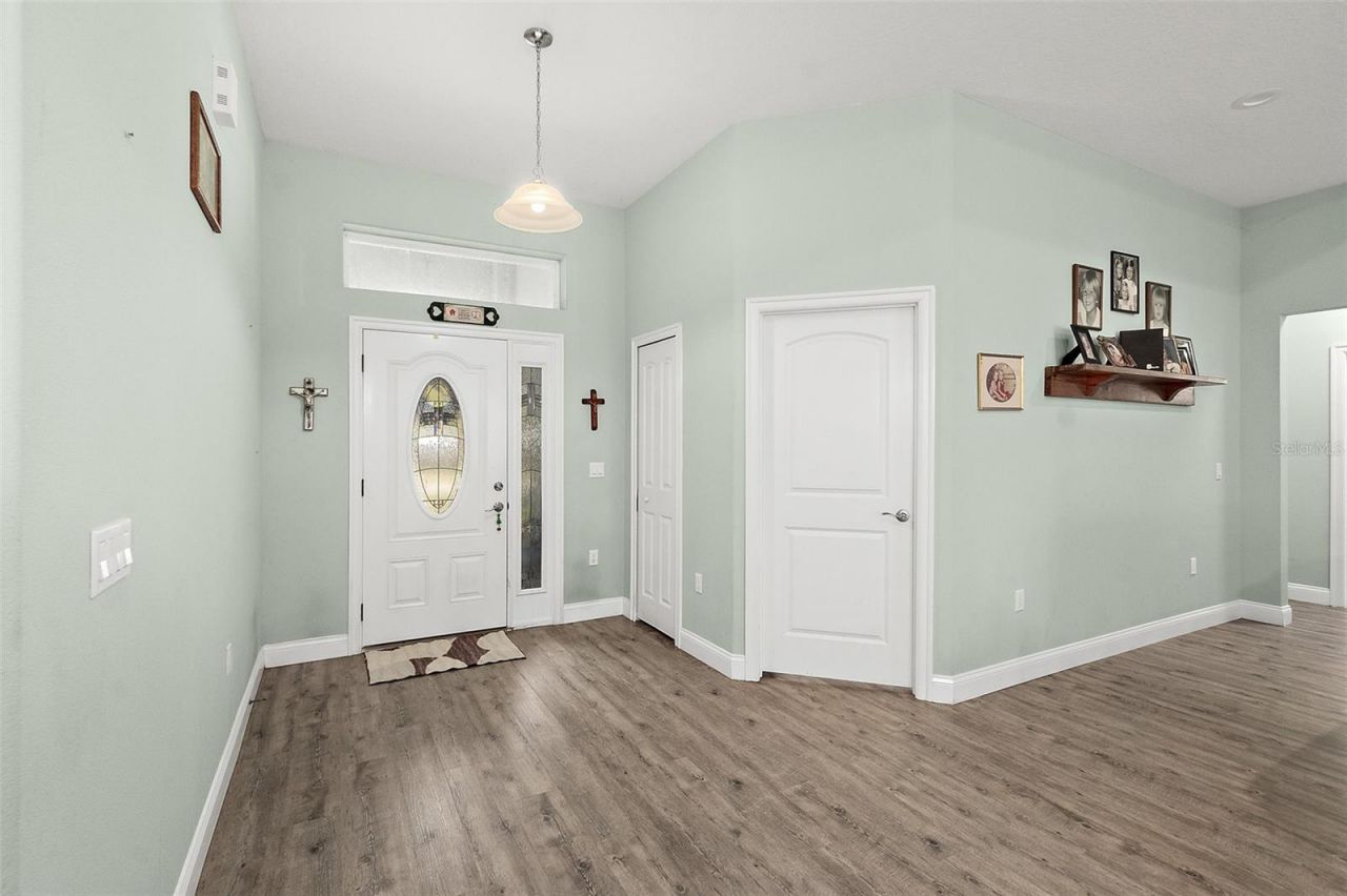 This spacious 5 year old 4 bedroom 2 bath home is located in the Pine Lakes Subdivision. Open concept with living room and kitchen separated by a large kitchen island for entertaining and space for cooking. Living room opens onto the lanai with sliding glass doors to allow lots of light in and your view in the back yard is a beautiful wooded area for privacy. The kitchen boasts a walk in pantry, large refrigerator and that center island is amazing. Master bedroom features lovely 17 x 14 room with tray ceiling and walk in closet and linen closet. Ensuite bathroom is spacious with a large walk in tiled shower and double sink vanity. The 4th bedroom can be used as an office or a bedroom and it has a built in closet for either use. Guest bathroom has a single vanity and a tub with shower head. 10x16 shed in back yard for storage.The house is equipped with solar panels that run the entire house. They will be paid off by seller at closing. This is adds an energy cost savings and more value to the home. Buyer will be able to assume ownership at closing.NO OWNER FINANCING AND NOT AVAILABLE FOR RENT!