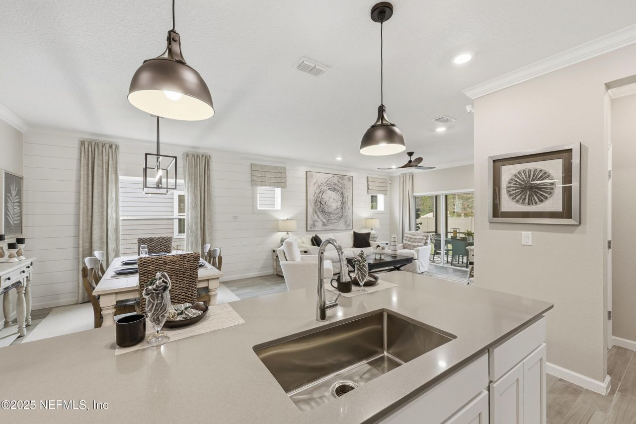 55+ Active Adult New Construction Model Home in Stillwater at St. Johns. The Sienna Villa floor plan offers 1,623 sq ft, 2 bedrooms, 2 baths, flexible space, and 2-car garage. Open layout with crown molding, wood-look tile, carpeted bedrooms, and shiplap accent wall in living room. Gourmet kitchen features white cabinets, gray quartz counters, gas cooktop, double wall oven, microwave, fridge, dishwasher, garbage disposal, and walk-in pantry. Washer and dryer included. Primary suite with large walk-in closet and walk-in shower; guest bath with tub/shower combo. Indoor living flows to screened paver lanai via 3-panel sliders. Dark iron lighting fixtures add style. Move-in ready with garage completed prior to occupancy.