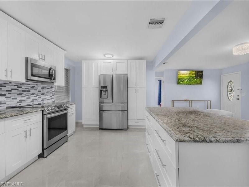 No HOA and fully renovated! This beautifully updated North Fort Myers home offers modern finishes, a bright open layout, and a spacious yard that’s hard to find. Inside, you’ll find a brand-new kitchen featuring white cabinetry, stainless steel appliances, granite countertops, and a stylish tile backsplash that opens to the main living area. New flooring runs throughout, along with a completely remodeled bathroom and fresh interior finishes that give the home a clean, updated feel. Enjoy the large screened front porch and an oversized fenced backyard with plenty of room for entertaining, pets, or even a future pool. The expansive yard is truly a standout feature, offering space and flexibility rarely found in this price range. Hurricane shutters provide added peace of mind. Located on a quiet cul-de-sac in an established North Fort Myers neighborhood just minutes from shopping, dining, and downtown Fort Myers, this updated home combines comfort, space, and convenience with no HOA restrictions.