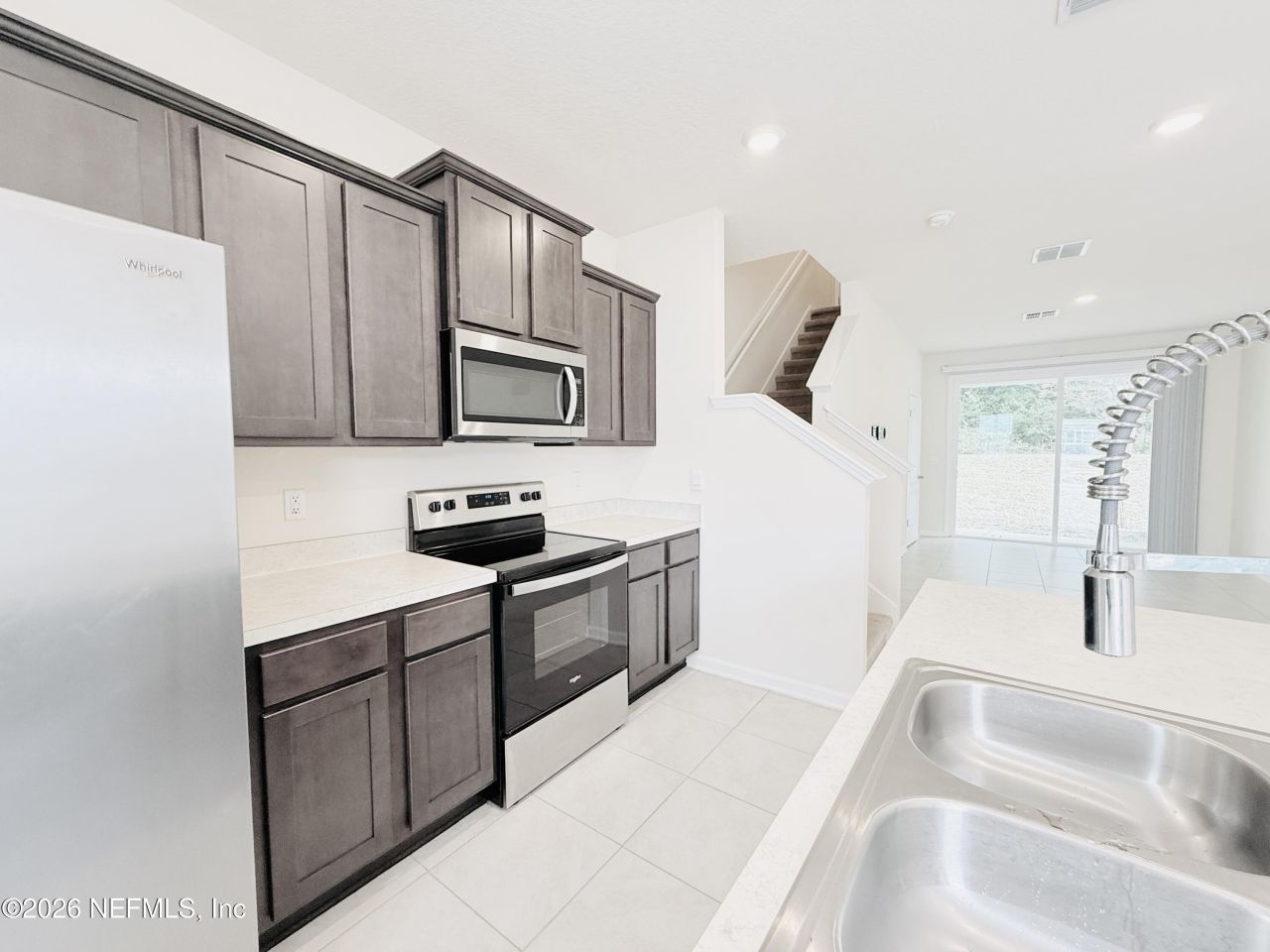 This beautifully maintained townhome offers modern living in a convenient location, close to shopping, dining, and major roadways. With an open-concept layout and contemporary finishes, the home feels spacious, bright, and move-in ready. The main living area features tile flooring throughout, recessed lighting, and a seamless flow between the living room, dining area, and kitchen. The kitchen is well appointed with stainless steel appliances, dark cabinetry, ample counter space, and a large island-ideal for both everyday living and entertaining. Sliding glass doors fill the space with natural light and provide easy access to the outdoor area. Upstairs, the bedrooms are comfortably sized each with their own bathroom and walk-in closets. This home provides quick access to everyday conveniences while still offering a comfortable residential setting.