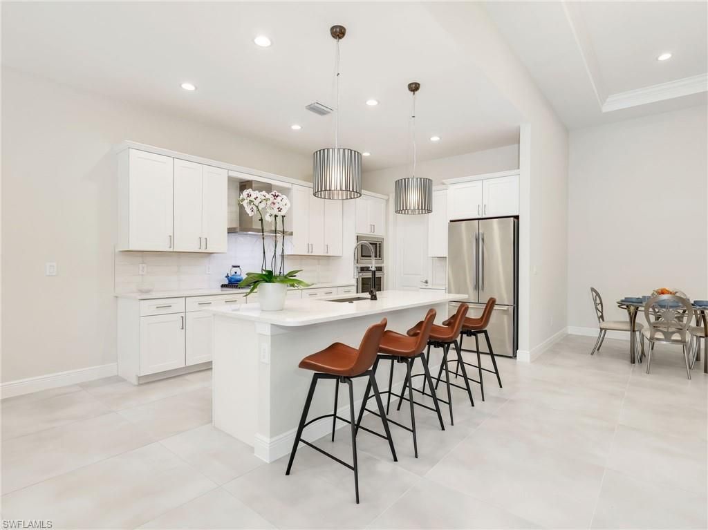 Located in the highly sought after community of Azure at Hacienda Lakes in Naples, this exceptional three bedroom, two and a half bathroom pool home offers refined finishes, thoughtful upgrades, and a seamless indoor outdoor living experience. A paver driveway welcomes you home and adds to the property’s polished curb appeal, setting the tone for the quality found throughout the residence. Inside, expansive 31 by 31 Emser Ironworx White tile flooring runs throughout the entire home, creating a clean and cohesive look. Impact resistant glass has been installed throughout, including the sliding glass doors. Tray ceilings accented with elegant crown molding add architectural detail, while the upgraded lighting package with additional recessed lighting enhances every room. Designer light fixtures in the dining room, living room, kitchen, and all bedrooms add character and style. Aftermarket custom light fixtures further elevate the overall design. The kitchen showcases White Brawny Maple pivot cabinetry paired with Top Knobs square pull hardware in brushed satin nickel. Cambria quartz countertops in Swanbridge with a three centimeter polished edge offer durability and a refined finish. The Shaw Arnold backsplash tile brings texture and dimension to the space. A KitchenAid upgraded appliance package provides both performance and visual appeal. The Kohler Vault single bowl stainless steel sink and Kohler faucet in Vibrant Stainless finish complete the kitchen with high quality fixtures. The primary suite offers a spacious and private retreat. The en suite bath includes a frameless glass shower door and a striking free standing soaking tub. Dual vanities provide ample counter space, while the open layout and quality finishes create a spa like atmosphere. The guest bath includes built in cabinetry for added storage and organization. A custom built in at the entryway from the garage adds function and convenience. Plantation shutters throughout the home provide privacy while maintaining a timeless and tailored appearance. Outdoor living is equally impressive. The fully equipped outdoor kitchen is designed for effortless entertaining. The pool area features an integrated spa and sun shelf, all enclosed within a panoramic screen enclosure that maximizes views and natural light. Hurricane rated automatic screens on the lanai provide additional protection and flexibility, allowing the space to be enclosed or opened with ease.